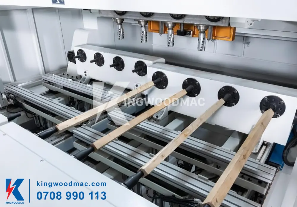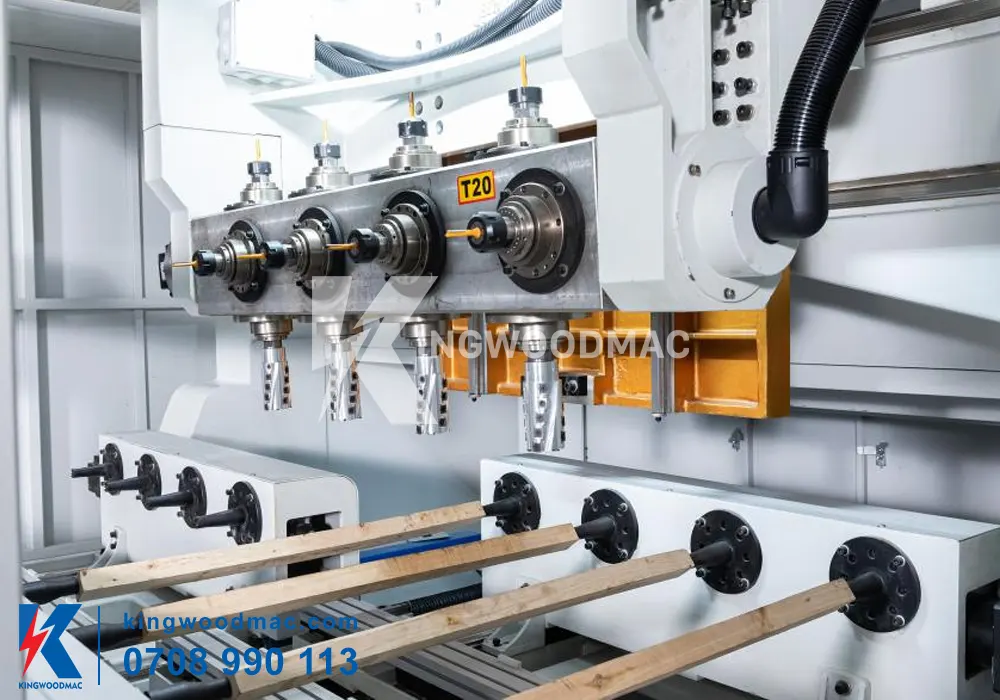 • Trục chính được trang bị 4 trục dao khác nhau, có thể xoay 360 độ với nhiều chức năng như khoan, phay, chạy rãnh và lắc mộng…